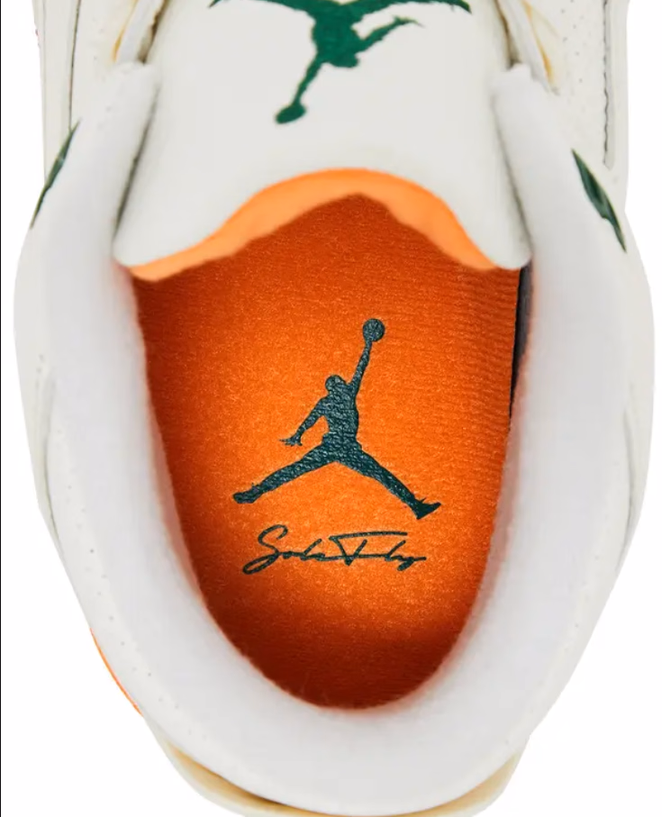 - Renkler: Ayakkabının ana rengini Sail (Yelken/Kirli Beyaz) tonu, Gorge Green (Koyu Yeşil) ve Bright Mandarin (Parlak Mandalina) renkleri oluşturuyor. Bu renkler, Miami’nin kültürel enerjisini yansıtıyor. Ayrıca Miami Hurricanes takımının renklerine gönderme yapıyor.